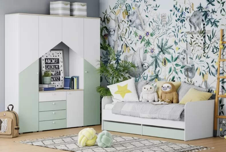 Особенности стиля детской «Банни» - это: светлые, спокойные оттенки в единой гамме. Скругленные ручки-кнопки не имеют острых граней. Ящики для хранения белья позволят навести порядок в комнате и расположить вещи. Скандинавская стилистика не любит загромождения мебелью. Только функциональность и практичность. Если правильно спланировать интерьер, в детской будет много места для хранения и пространства для игр. Фасады выполнены из МДФ с покрытием пленкой ПВХ.