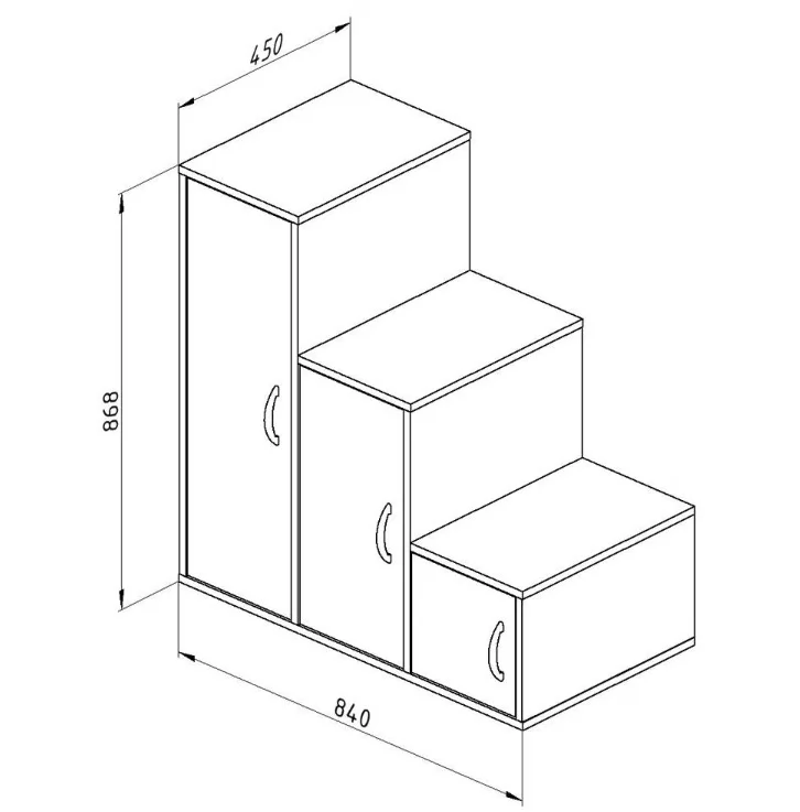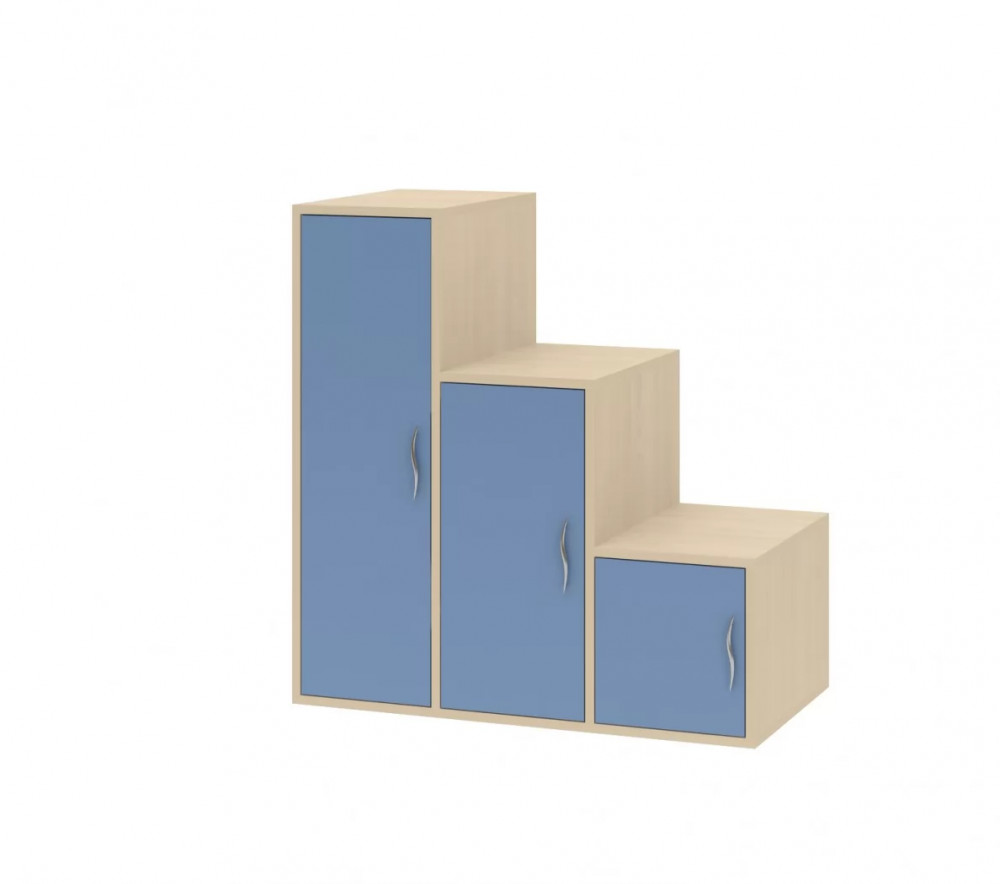 Лестница состоит из трех отделений, оборудованных распашными дверцами. Внутри отделений расположены полочки, которые можно использовать для хранения игрушек и других личных вещей ребенка.