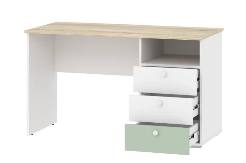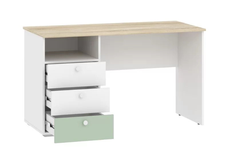 Одним из важнейших принципов развития ребенка является обустройство его рабочего места, где школьник сможет выполнять уроки, заниматься творчеством и любимым хобби. Письменный стол НМ 041.40 «Банни» с тумбой позволит оформить в спальне рабочий уголок в скандинавском стиле. Данная модель дополнена небольшим модулем из трех выдвижных ящиков и открытой ниши. Вместительная полка под рабочей поверхностью прекрасно подходит для книг и тетрадей. Тумбу с ящиками возможно разместить как в левой, так и в правой части изделия в зависимости от предпочтений ребенка. Ящика с удобными ручками легко выдвигаются, предоставляя полный доступ к содержимому и позволяя быстро найти необходимый предмет.