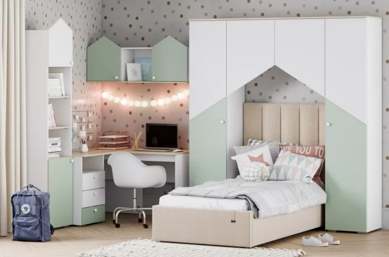 Особенности стиля детской «Банни» - это: светлые, спокойные оттенки в единой гамме. Скругленные ручки-кнопки не имеют острых граней. Ящики для хранения белья позволят навести порядок в комнате и расположить вещи. Скандинавская стилистика не любит загромождения мебелью. Только функциональность и практичность. Если правильно спланировать интерьер, в детской будет много места для хранения и пространства для игр. Фасады выполнены из МДФ с покрытием пленкой ПВХ.