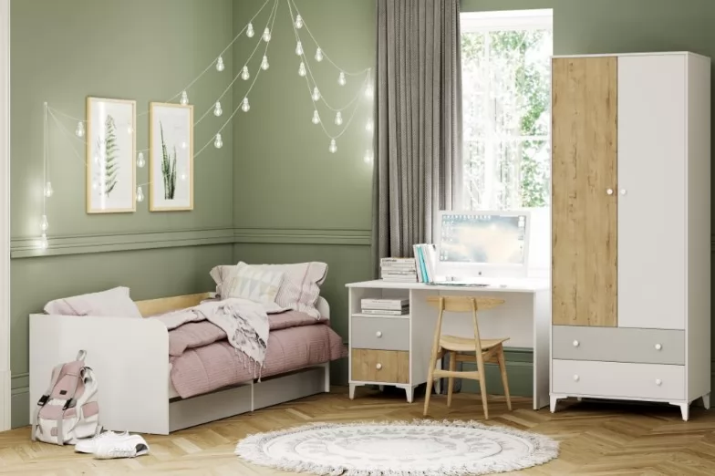 Практичный и спокойный скандинавский стиль новой коллекции «Морти» идеально подходит для интерьера детской комнаты. Он легко трансформируется, «растет» вместе с ребенком. Меняя цветовые акценты: текстиль и декор, которыми можно оформить комнату для мальчика или девочки, малыша или подростка. Особенности стиля детской «Морти» - это: светлые, умиротворяющие оттенки в единой гамме, мебель простой формы, безопасная для детей. Скандинавская стилистика не любит загромождения мебелью. Только функциональность и практичность. Модульная композиция Комплектации 3 включает: шкаф, письменный стол и кровать с мягкой спинкой. Высокие опоры придают легкость конструкции и не создают препятствий для проведения влажной уборки. Чтобы процесс обучения приносил ребенку больше положительных эмоций, необходимо обустроить комфортное место для занятий дома. Письменный стол поможет комфортно и удобно делать домашнее задание, выполнять различные работы. Если правильно спланировать интерьер, в детской будет много места для хранения и пространства для игр.