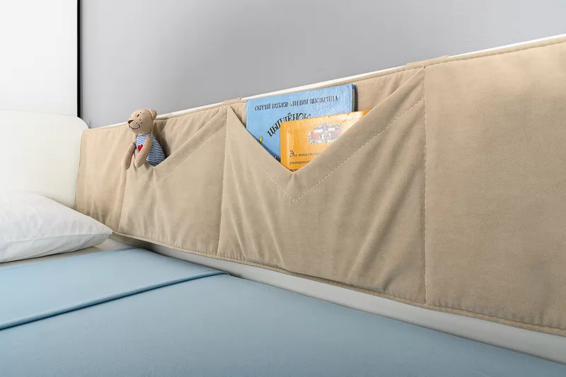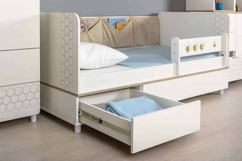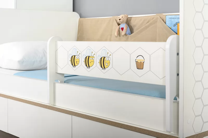 Кровать оснащена съёмным мягким элементом с карманами, передвижным бортиком и декорирована оригинальным рисунком - мультяшными пчёлками, которые никого не оставят равнодушным.