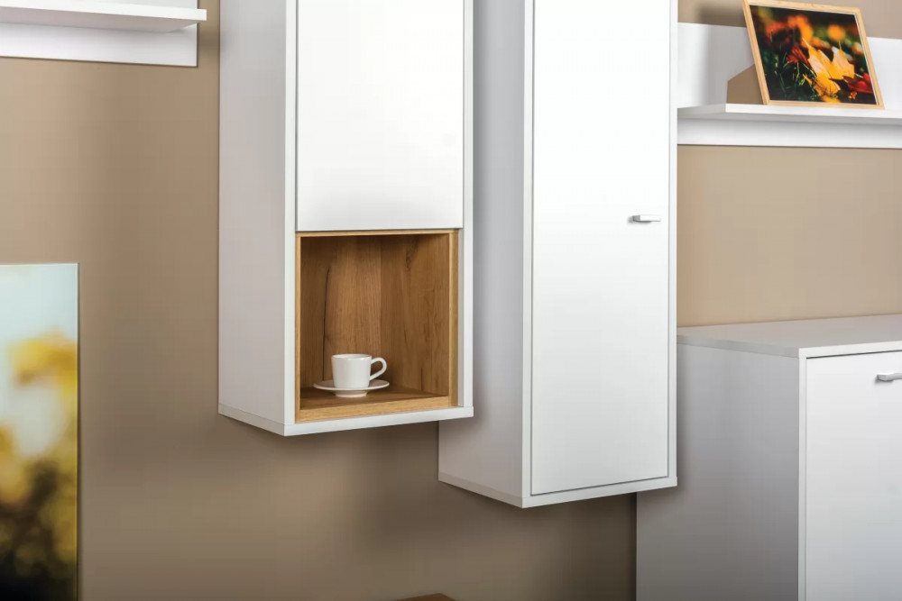 Гостиная модульная система "Бэль" сочетает в себе актуальные цвета и функциональную геометрическую форму с мотивами конструктивизма.