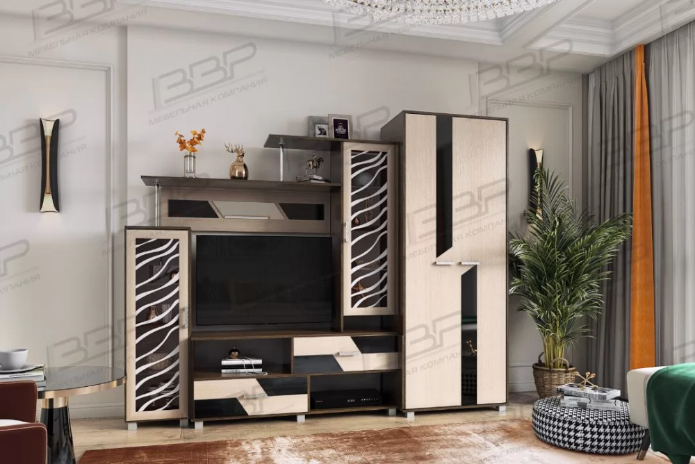 Модульная система Нота-9 привлекает не только своей компактностью и функциональностью, но и её самобытным дизайном. В этой гостиной присутствует ритм и стиль за счёт игры горизонтальных линий во всём: на матовых стёклах с пескоструйным рисунком, на фасадах выдвижных ящиков, на дополнительном декоре в верхней части стенки – везде графика и геометрия линий.