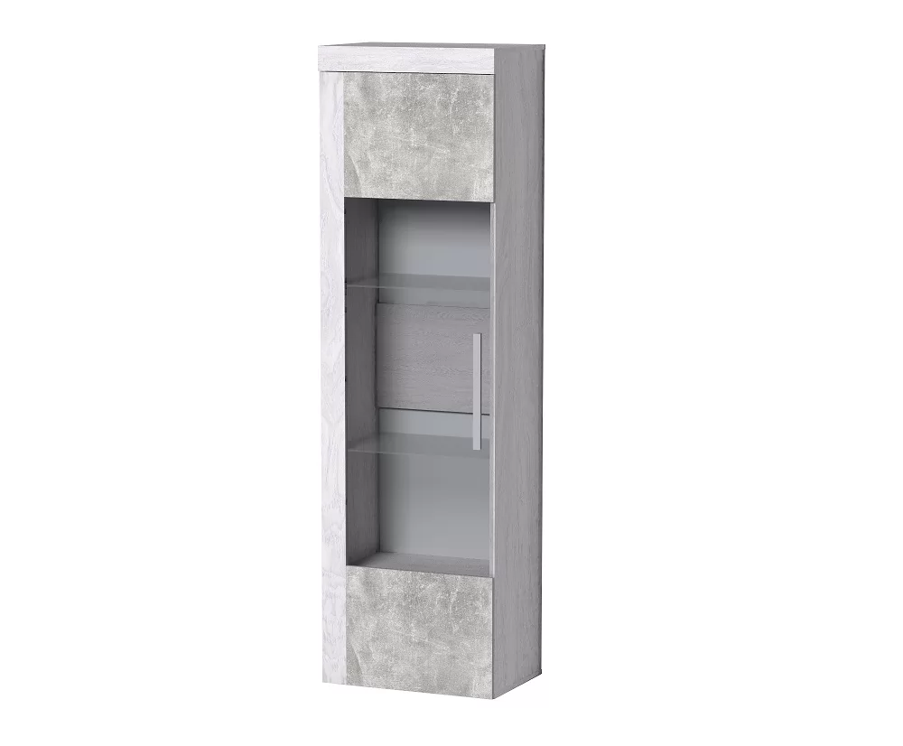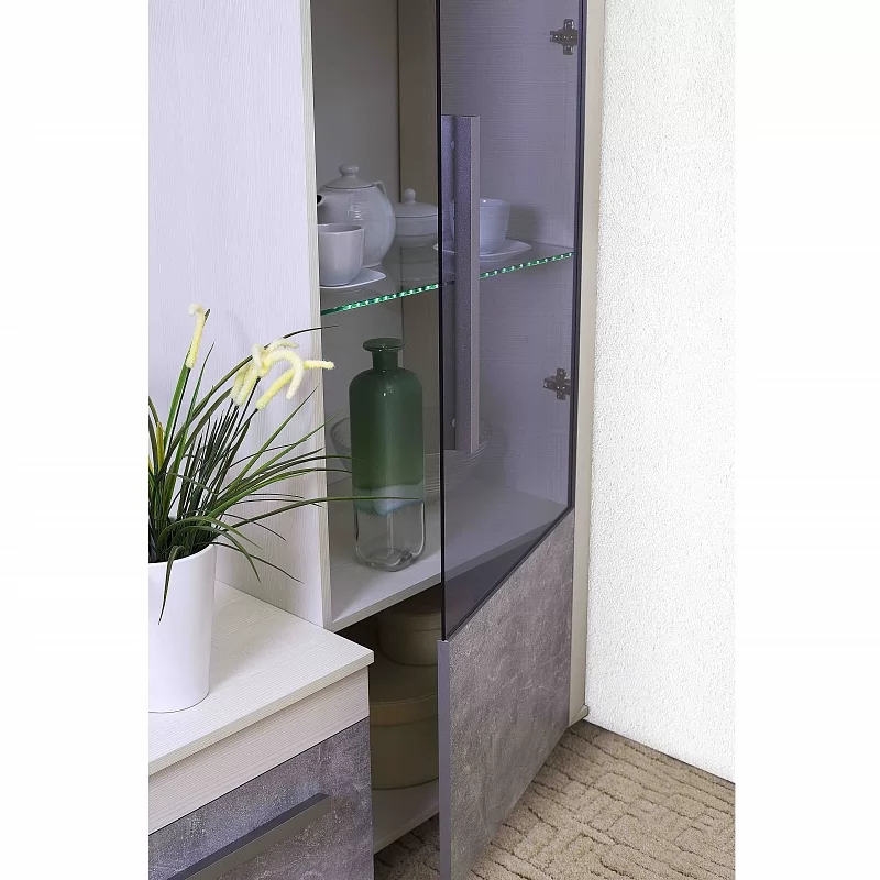 Посудный шкаф со стеклянной дверцей позволит выставить в гостиной те коллекционные и памятные вещицы, которыми вы дорожите. Стеклополки в обработке еврокромкой выдерживают до 10 кг каждая. Фасад перенавешивается на левую и правую сторону. Серебристая стильная ручка из массива дерева и серое тонирование стекло фасада вносят смелые дизайнерские штрихи в восприятии актуальноого декора "под бетон".