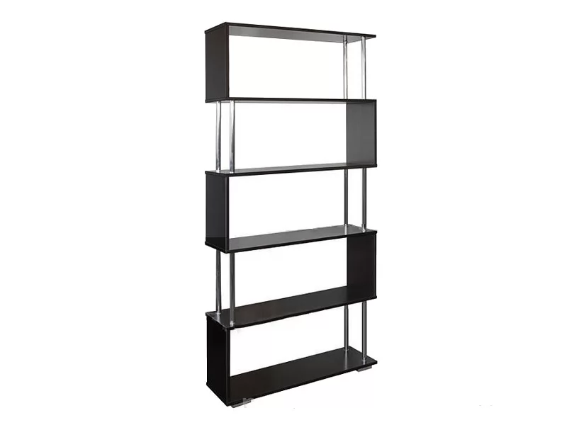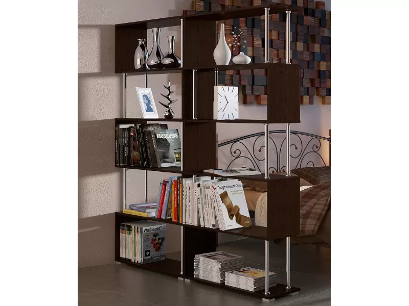 - невесомости основным полкам стеллажа, выполненным в темном цвете венге, придают хромированные штанги.