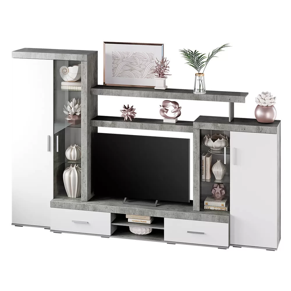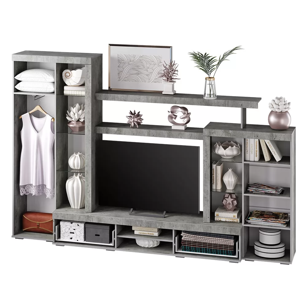 Цвет бетон корпуса в комбинации с белыми фасадами и вставками из стекла придают гостиной Интсайл легкости. Два распашных шкафа, в один из которых встроена хромированная штанга, позволят разместить личные вещи и предметы гардероба. На нескольких открытых полках вы сможете хранить сувениры, фотографии или предметы декора.