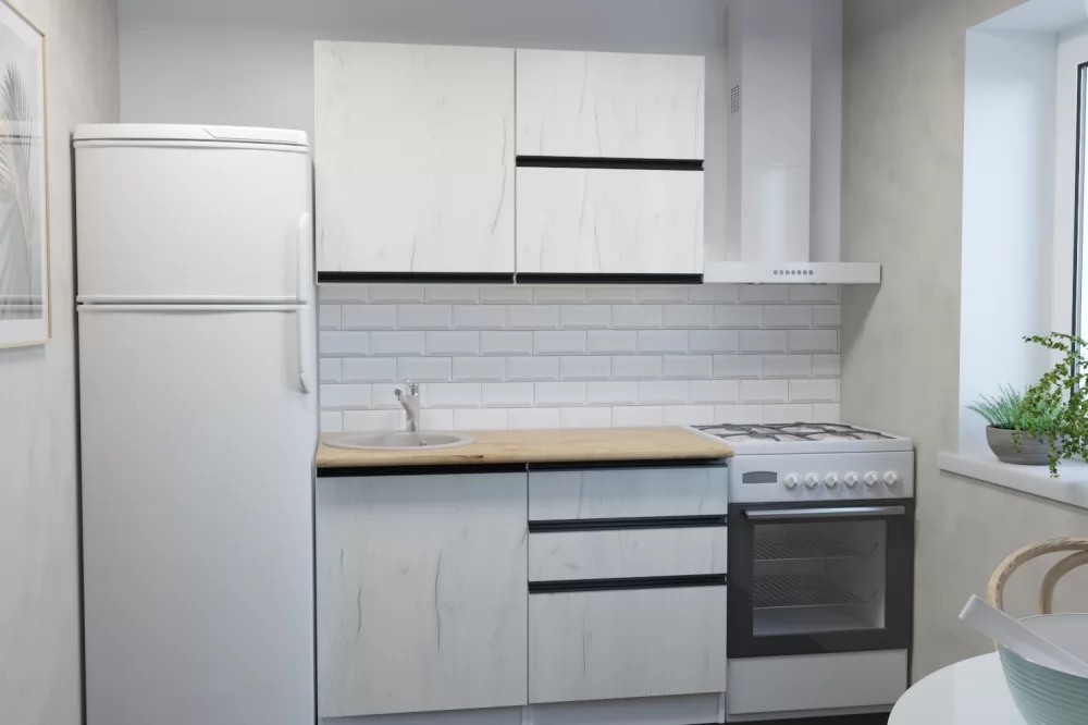 Прямые готовые кухни рациональны для маленьких квартир. При прямой планировке кухни важно предусмотреть место для холодильника и учесть его габариты. Если ваша кухня объединена с гостиной, или же настолько просторная, что позволяет сделать полноценную обеденную зону для большой семьи, то смело выбирайте линейную конфигурацию кухни.