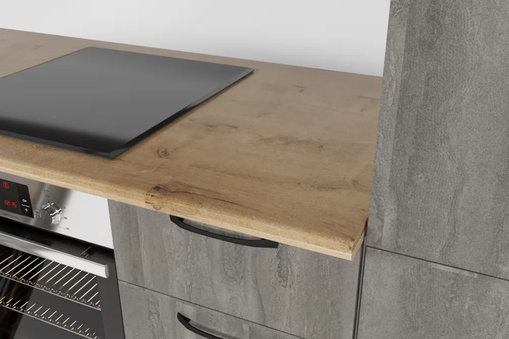 Тумба под врезную мойку (Ш × Г × В): 500 × 600 × 850 мм. Рабочий стол (Ш × Г × В): 400 × 600 × 850 мм. Стол под духовой шкаф (Ш × Г × В): 450 × 600 × 850 мм. Комплект для посудомоечной машины: 450 мм. Навесной шкаф с полками (Ш × Г × В): 500 × 300 × 720 мм. Навесные шкафы (Ш × Г × В): 450 × 300 × 720 мм, 2 шт. Навесной шкаф (Ш × Г × В): 400 × 300 × 720 мм. Мойка, смеситель, посудосушитель и бытовая техника в комплект гарнитура не входят.