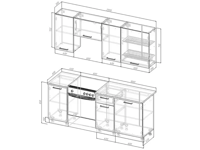 - Фасады верхних модулей со свесом – дают возможность использовать модули без установки ручек, а также установить скрытую подсветку;