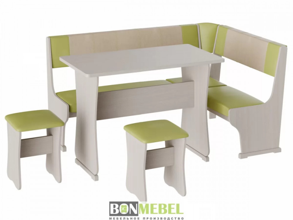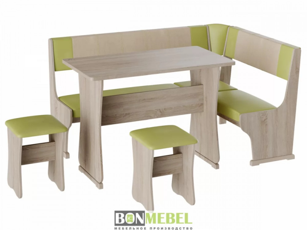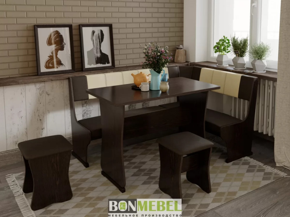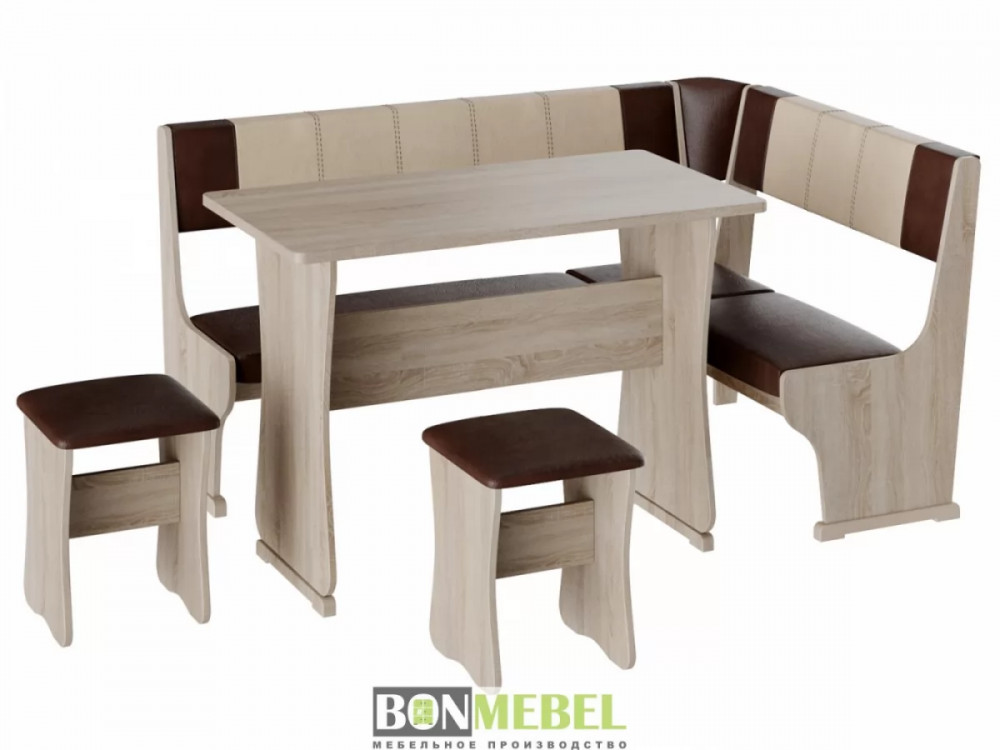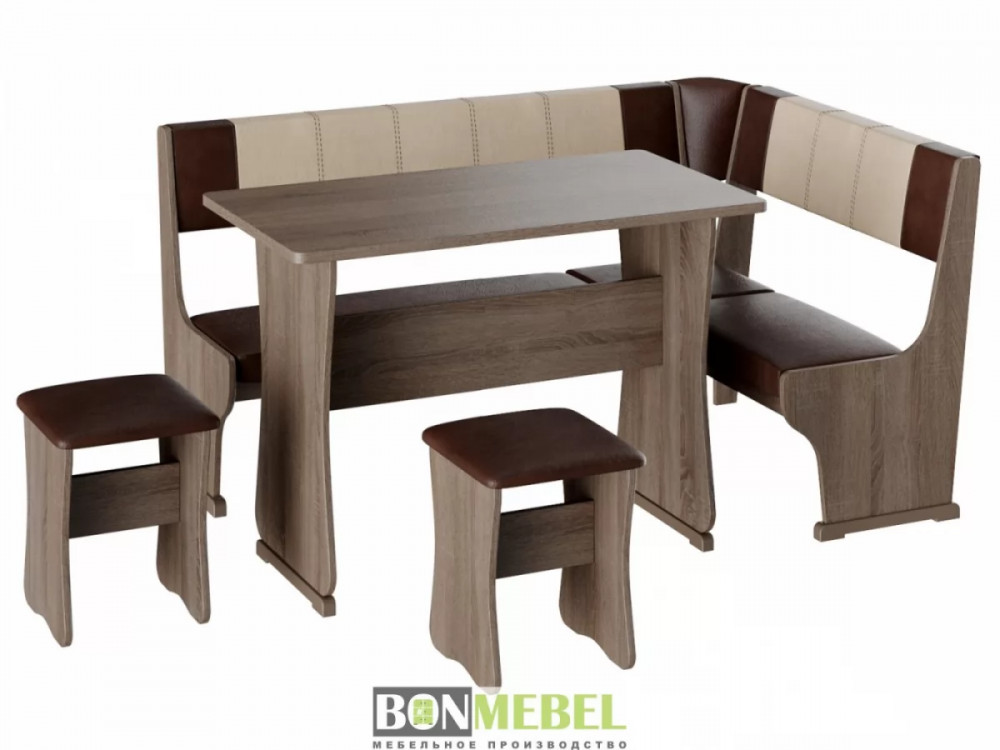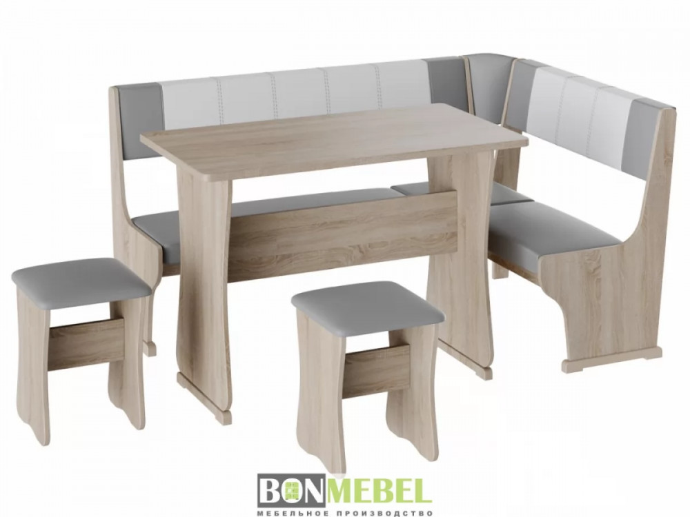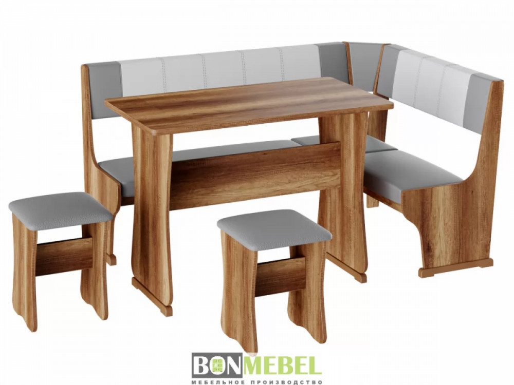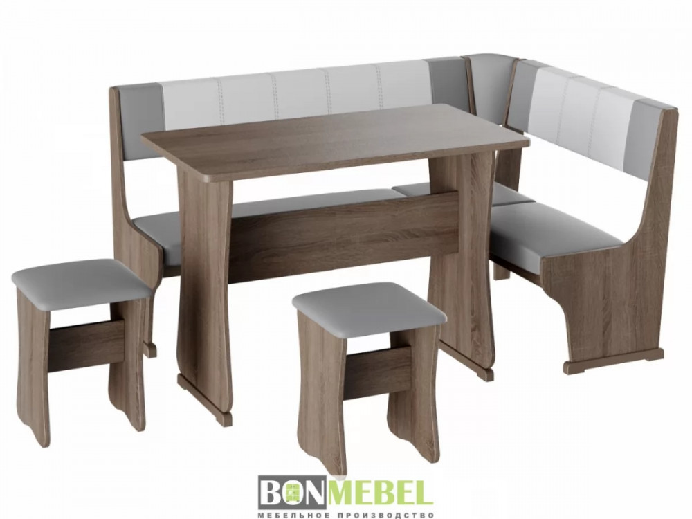 Кухонный уголок Гамма тип 1 с обеденным столом и двумя табуретами в комплекте. Набор идеально подойдет для оформления небольшой кухни дома и на даче. Угловая скамья универсальна по сборке. Обратите внимание! Ящики для хранения под сиденьями скамьи не предусмотрены. Каркас уголка, табуретов и стола изготавливаются из ЛДСП. Для обивки используется экокожа.