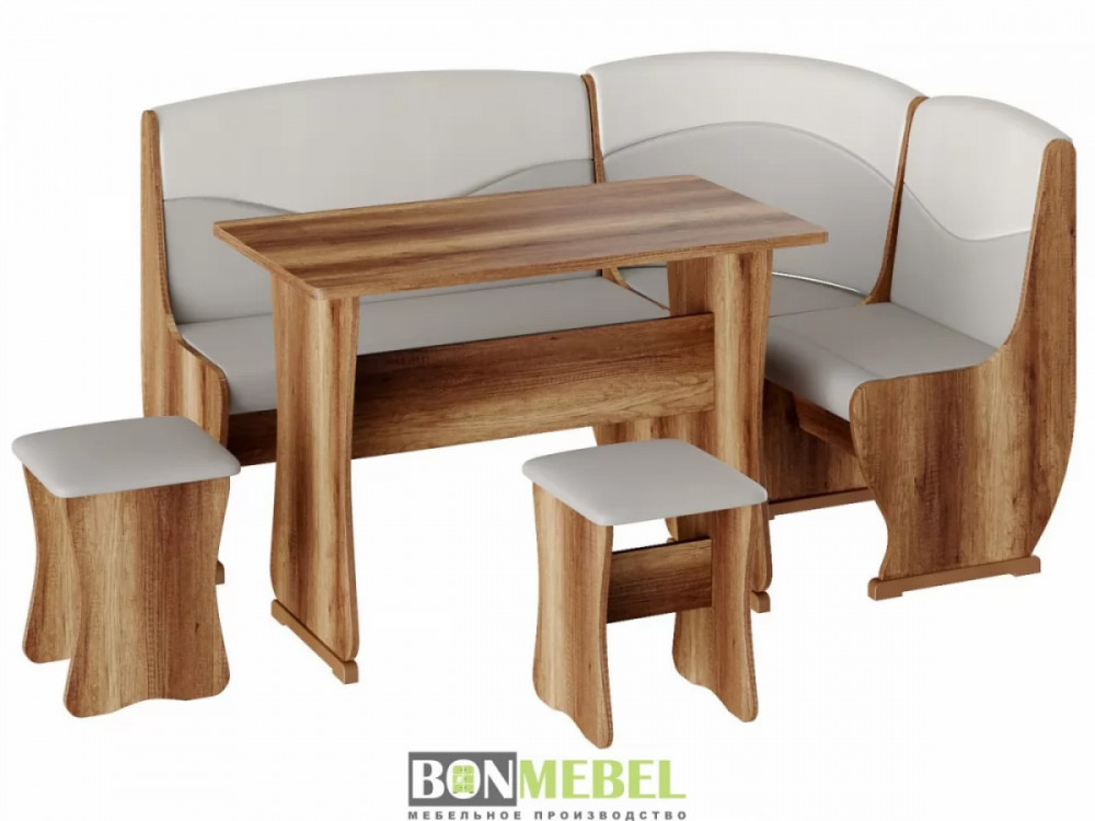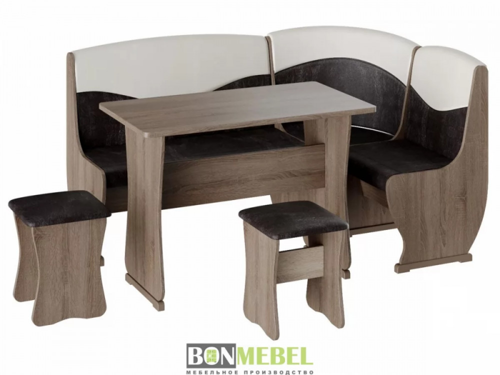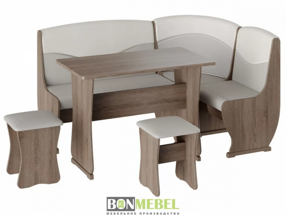Кухонный уголок Уют тип 2 с обеденным столом и двумя мягкими табуретами. Каркас уголка, стол и табуреты изготавливаются из ЛДСП. Универсальный тип сборки — скамью можно собрать как длинной стороной слева, так и справа; ящики под сиденьями — полезная деталь для хранения мелочей на кухне; обивка из экокожи — практичная и легкая в уходе, особенно на кухне.