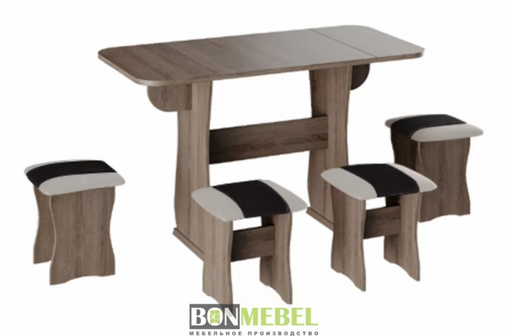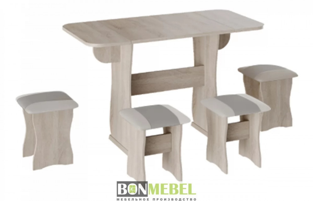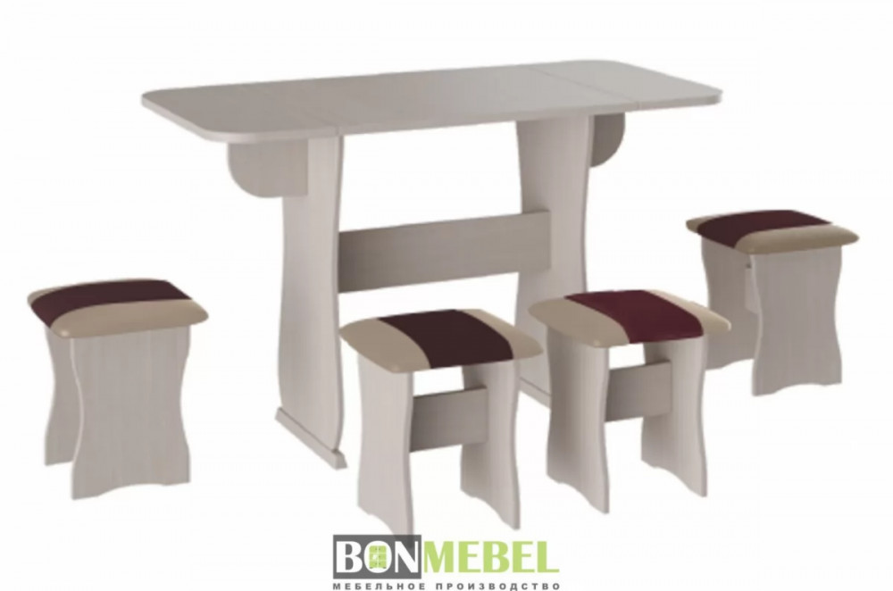 Обеденная группа с табуретами Тип-4 поможет стильно и практично оформить пространство даже на малогабаритной кухне. Комплект рассчитан на четыре персоны. Раскладной стол позволит увеличить ширину стола почти на 55 см за считанные секунды. Обивка из экокожи устойчива к различным загрязнениям и не требует обработки специальными средствами. Мягкие сиденья табуретов имеют мягкое и упругое наполнение, что повышает уровень комфортабельности. Различные варианты расцветки помогут подобрать идеальный комплект. Для изготовления изделий используется прочная ЛДСП. Обивка табуретов выполнена из искусственной кожи.