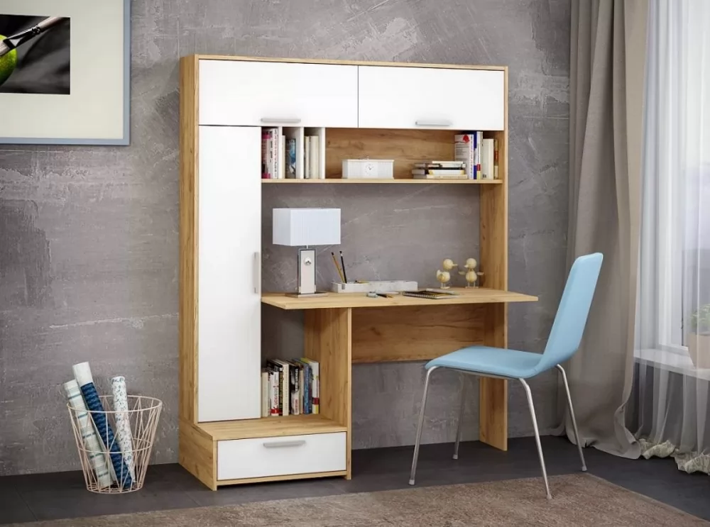 Рабочий стол отлично подойдет для комнаты школьника или организации домашнего офиса. Современный дизайн конструкции прекрасно впишется в интерьер любой комнаты. На широкой столешнице можно свободно разместить ноутбук, настольную лампу и письменные принадлежности. Богатая система хранения позволит содержать рабочее место в чистоте и порядке. Конструкция состоит из закрытого вертикального блока с тремя полками, выдвижного ящика и двух объемных ниш с откидными дверцами. Дополнительно в систему включена большая открытая полка с отсеками для документов.