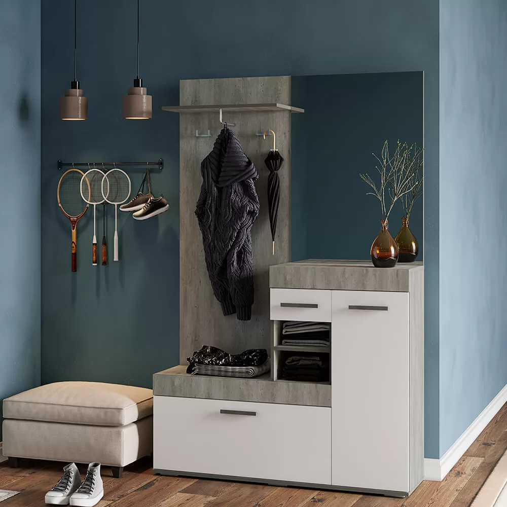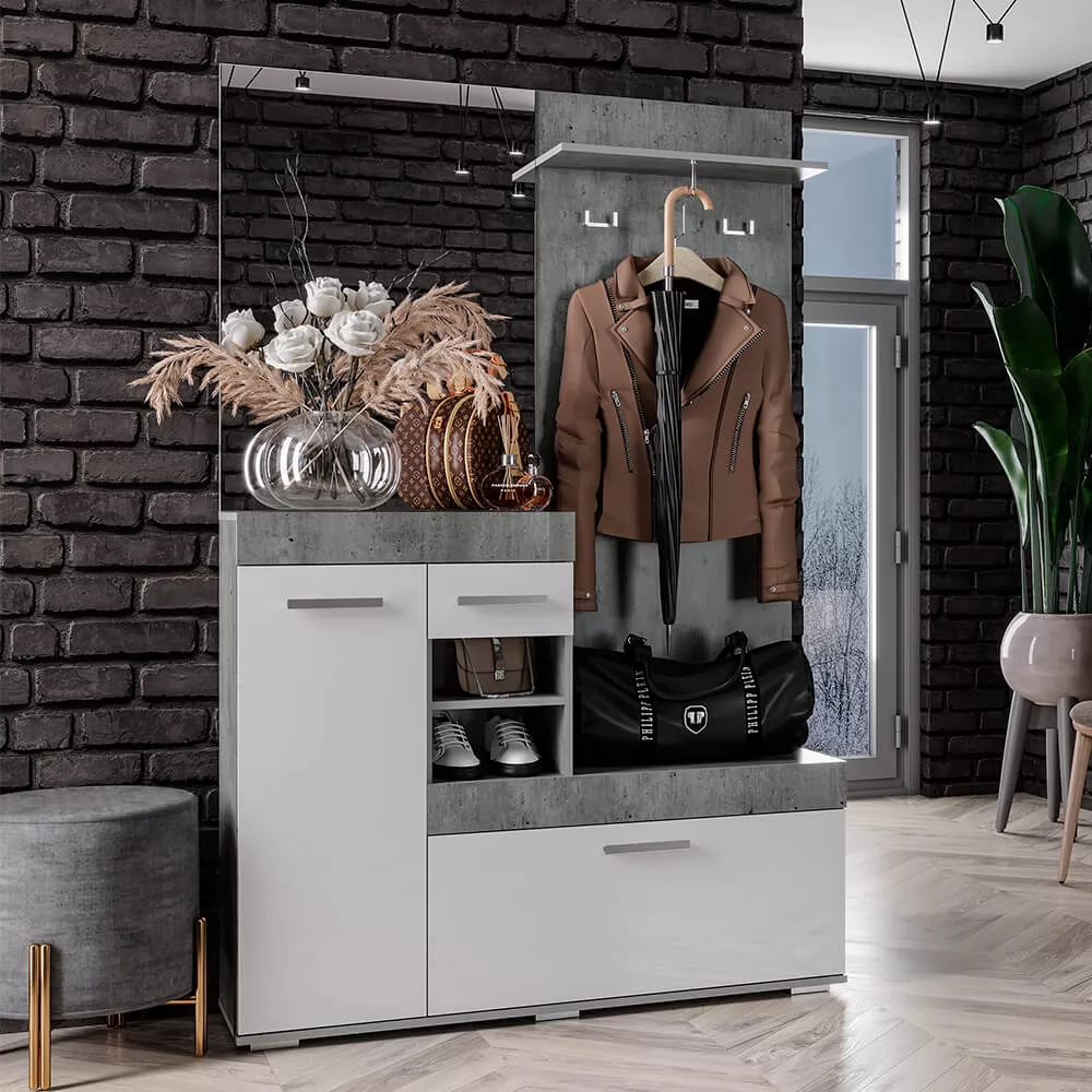 Сочетание белого цвета с фактурой бетона; Наличие большого зеркала облегчают конструкцию и позволяют ей расширить пространство; Все створки, за которыми спрятаны полки для хранения вещей и обуви, оснащены эргономичными хромированными ручками.