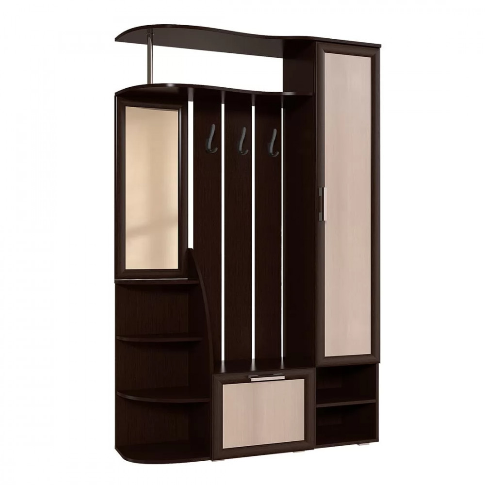 - модель состоит из распашного шкафа, открытой зоны с крючками для одежды и полками для аксессуаров, а также отделения для обуви,