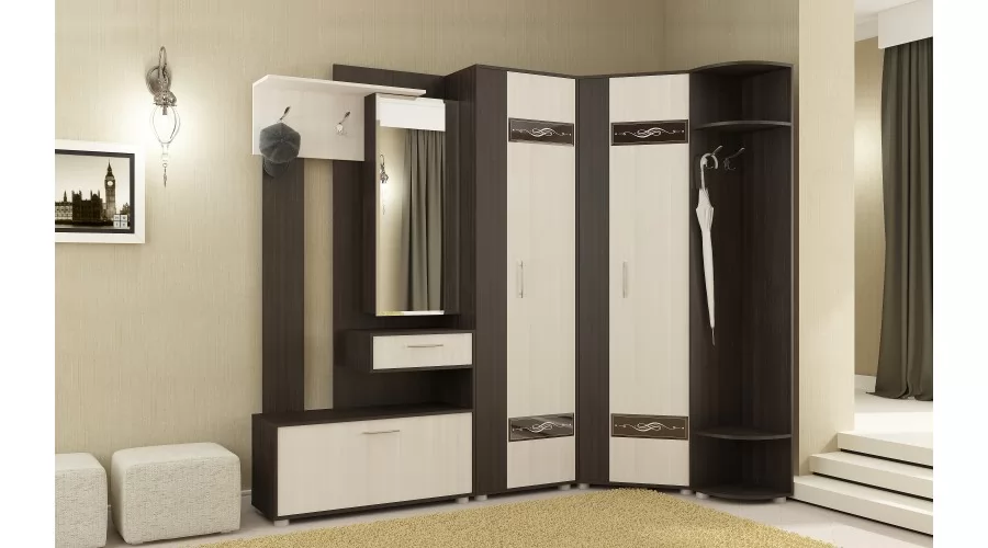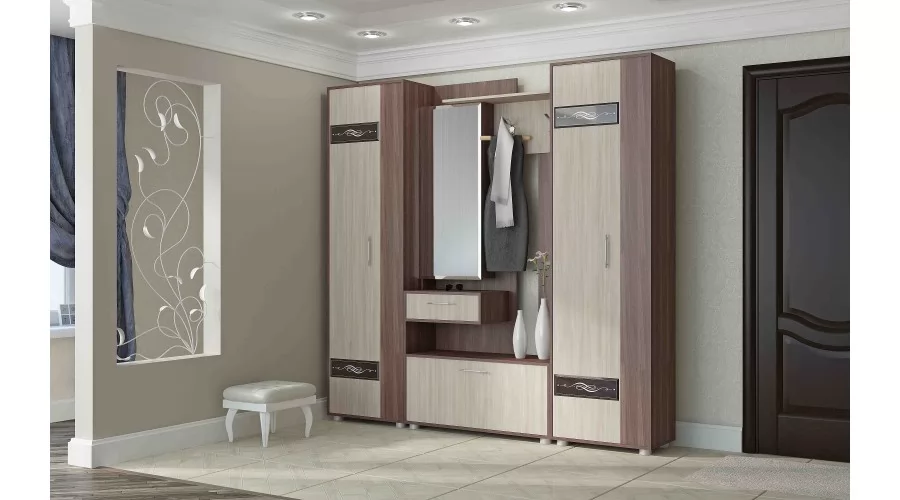 Секция с зеркалом (зеркало имеет широкий фацет по периметру) может быть собрана как на левую, так и на правую сторону. Фасады шкафов универсальные и могут быть установлены в зеркальном отображении, что позволяет открывать шкаф как на левую, так и на правую сторону. В наполнение шкафа-пенала входит выдвижная штанга и четыре полки. В качестве дополнительного декора фасадов использовано декоративное стекло с широким фацетом и рисунком, окрашенное по специальной технологии, усиливающее глубину восприятия. Створка обувницы имеет два газ лифта, выдвижной ящик на роликовых направляющих, применены регулируемые по высоте опоры, высокопрочные крючки. Задние стенки и дно ящика выполнены из ламинированного и облагороженного ЛДВП в цвет корпуса.