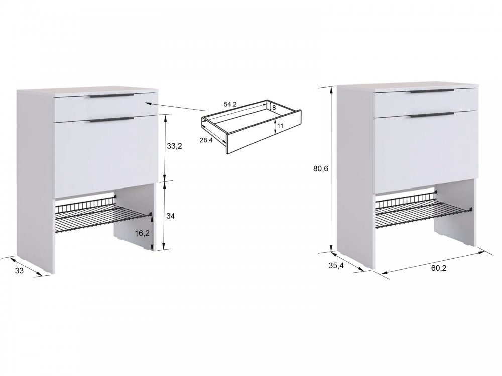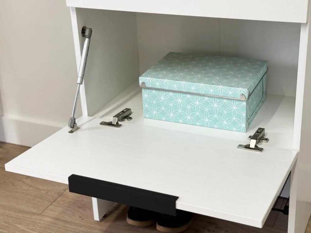 Изготовленная из прочного ЛДСП толщиной 16 мм, обувница обеспечивает надежность и долговечность. Выкатной ящик на шариковых направляющих позволяет легко и плавно открывать и закрывать его, предоставляя дополнительное место для хранения мелочей.