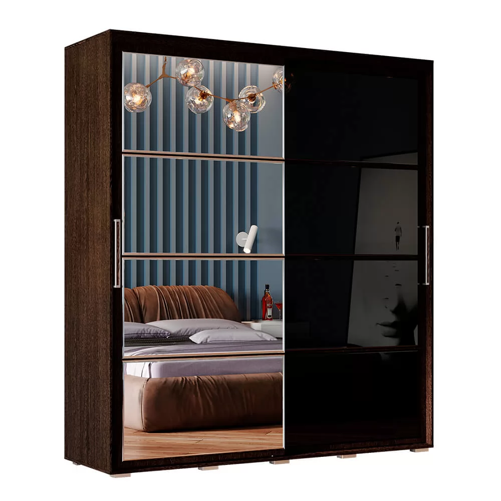 - модель изготовлена из ЛДСП, одна раздвижная створка выполнена из темного стекла, а вторая – зеркальная, - такой прием облегчает конструкцию и позволяет расширить пространство, - внутри модель состоит из многочисленных полок и ящиков для белья и одежды, - а также отделения со штангой для плечиков.
