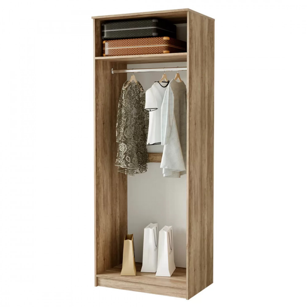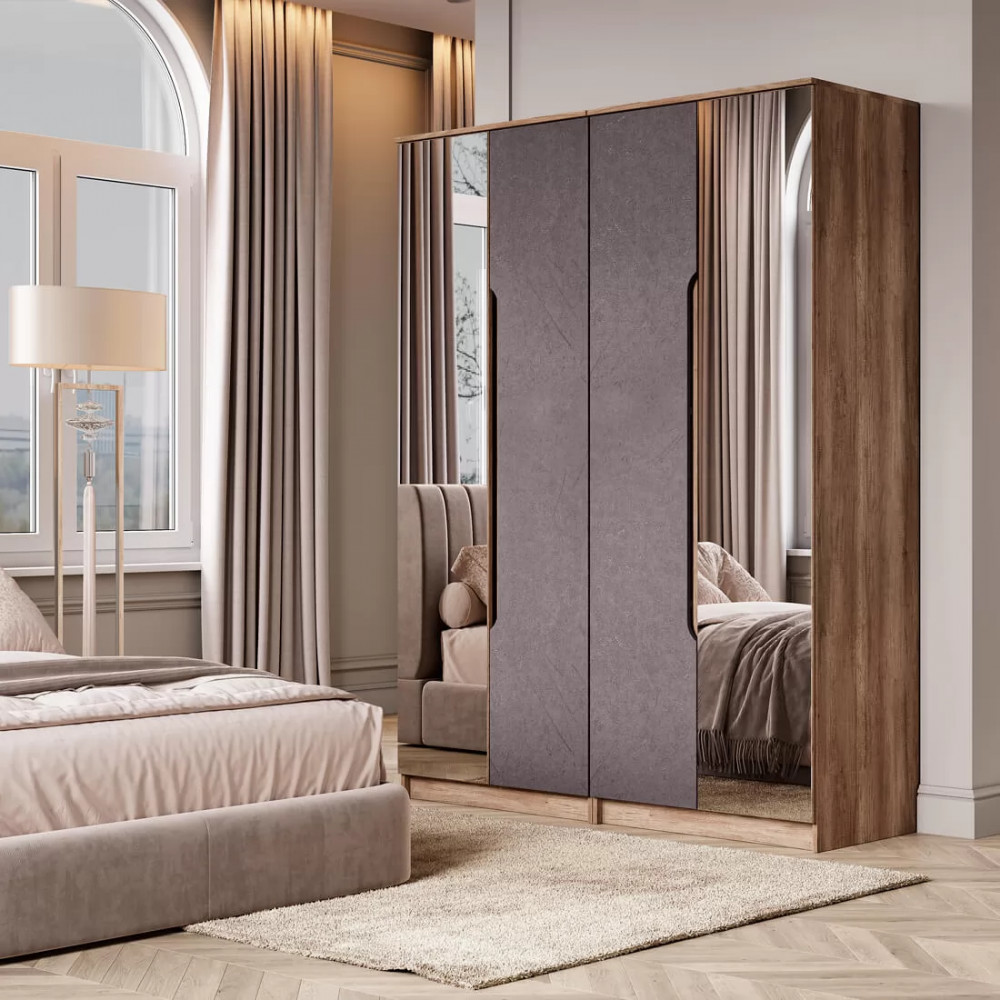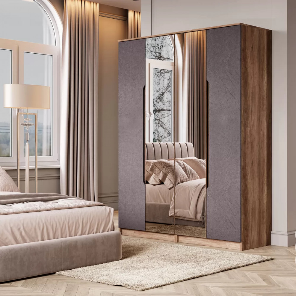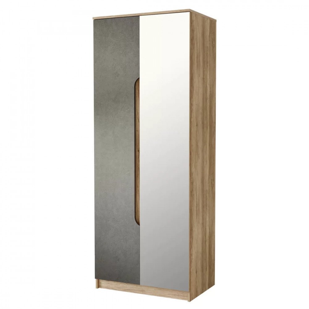 -изделие имеет дизайн, характерный для остальной мебели одноименной модульной серии, -корпус выполнен из ЛДСП теплого цвета дуб каньон, -одна створка с оригинальной интегрированной ручкой выполнена в цвете «лофт графит», а вторая – полностью зеркальная. -внутреннее наполнение состоит из платяного отделения с горизонтальной хромированной штангой и просторной антресоли.