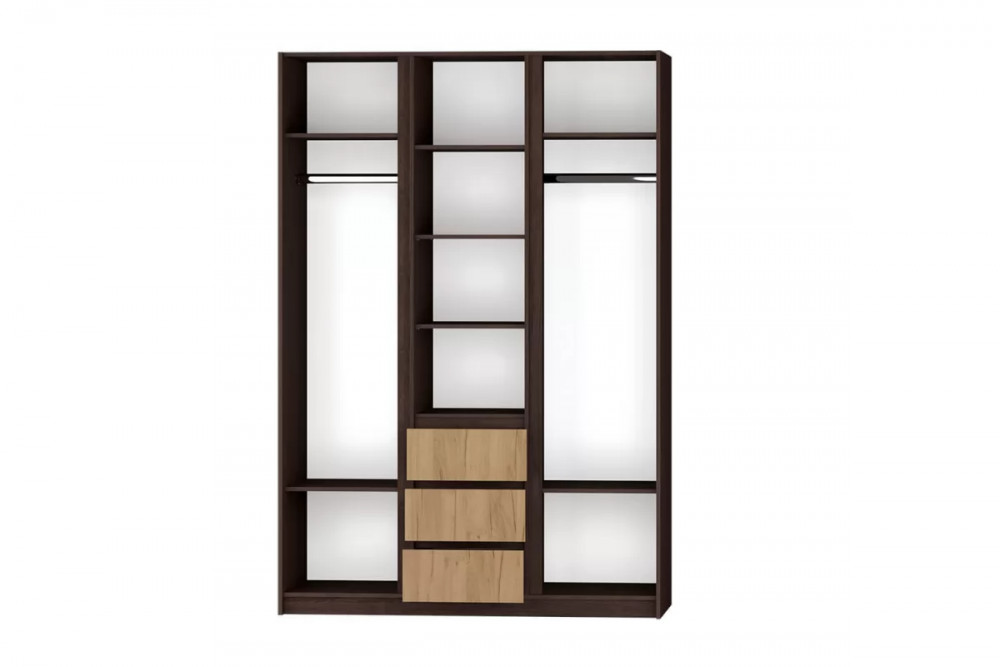 Шкаф имеет 2 отделения для размещения одежды на плечиках и отделение с полками.