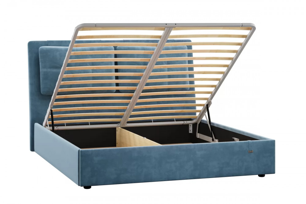 Подъемный механизм легок в управлении, а вместительный короб внутри кровати подойдет для хранения подушек, белья и других вещей.