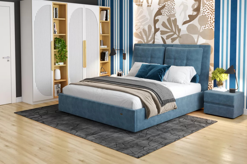 Кровати выполнены в нейтральных и в ярких тканях велюр, что позволяет подобрать подходящий вариант почти под любой интерьер. В качестве декора применяются декоративные подушки на изголовье.