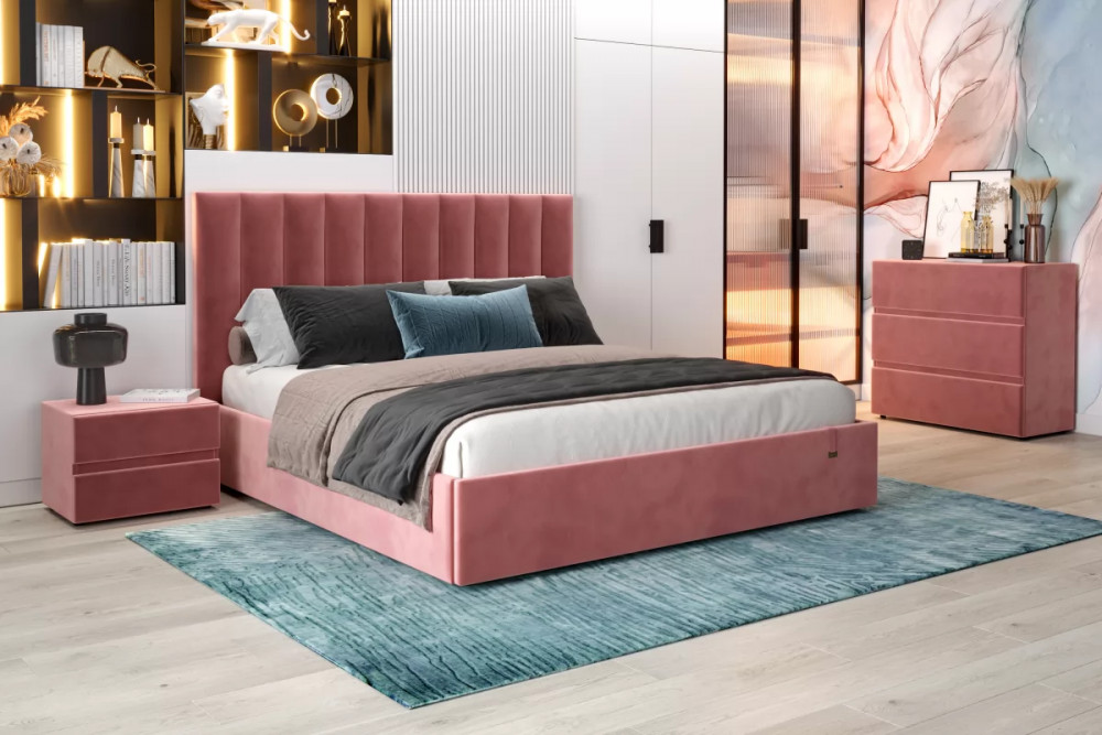 Кровать «Ingrid» подойдет для современных интерьеров спален, впишется в стиль ретро и скандинавский минимализм. Обивка будет отлично сочетаться с любыми цветовыми оттенками отделки и мебели. Кровати выполнены в нейтральных и ярких тканях велюр, что позволяет подобрать подходящий вариант почти под любой интерьер. Изголовье имеет прямоугольную форму, повторяя очертания кровати. Дизайн модели отличается высоким изголовьем с вертикальными строчками и углублениями.
