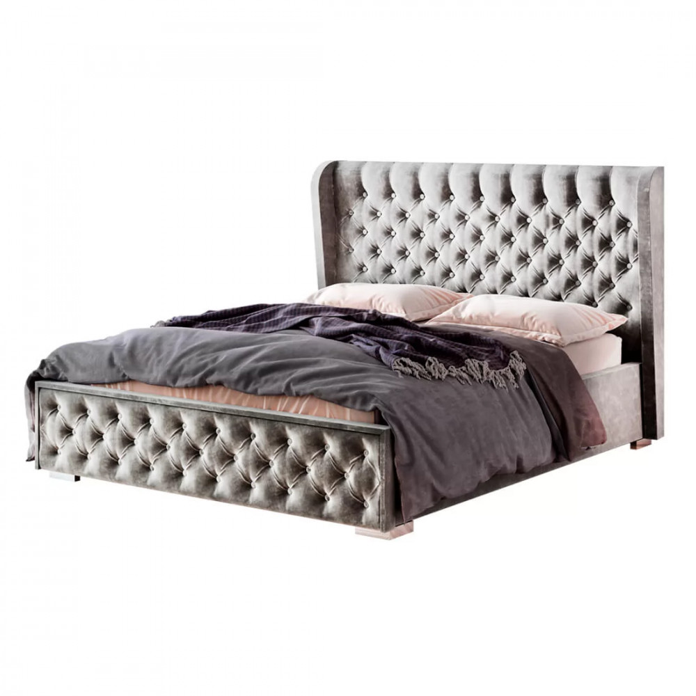 -высокое мягкое изголовье имеет декоративную стяжку с пуговицами, такой прием придает кровати элегантности.