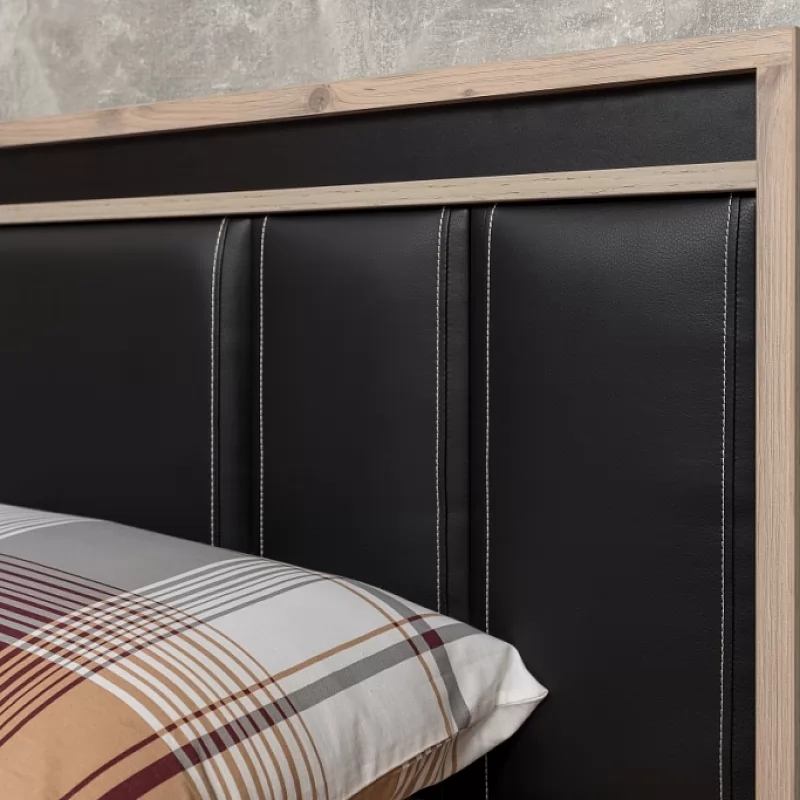 Двуспальная кровать NATURE станет стильным дополнением для вашей спальни. Спокойный приятный древесный декор поможет создать атмосферу настоящего уюта и комфорта в комнате. А контрастные черные вставки из ЛДСП и декоративные золотые нити на черной экокоже сделают изголовье кровати интересным и современным. Экокожа очень легко чистится и не выгорает под воздействием солнечных лучей.