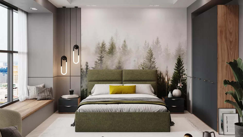 Спальный гарнитур «Глосс» №10 Яблоня Беллуно, Стекло Графит матовый, Микровелюр Jercy Deep Green в Нягани