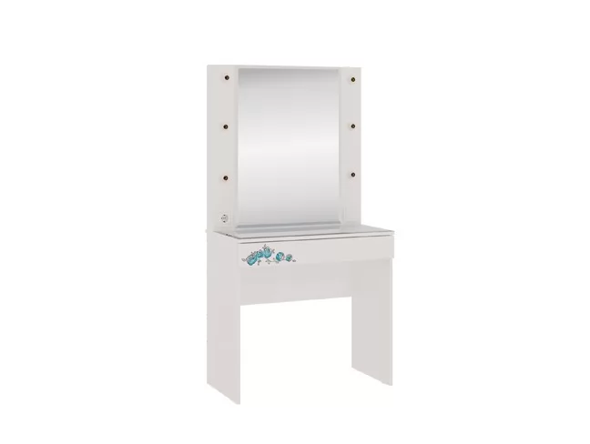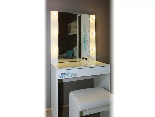 Трендовое трюмо из серии «Гламур». В зеркало с широким фацетом,  встроена подсветка, как в столах профессиональных визажистов. Дополнительно имеется выключатель, розетка для фена и выдвижной ящик для украшений и косметики. Украшение трюмо - белый глянцевый фасад ящика с 5D фрезеровкой, принтерным рисунком. Стеклянная столешница трюмо с фацетом по периметру и противоосколочной пленкой, легка в уборке.